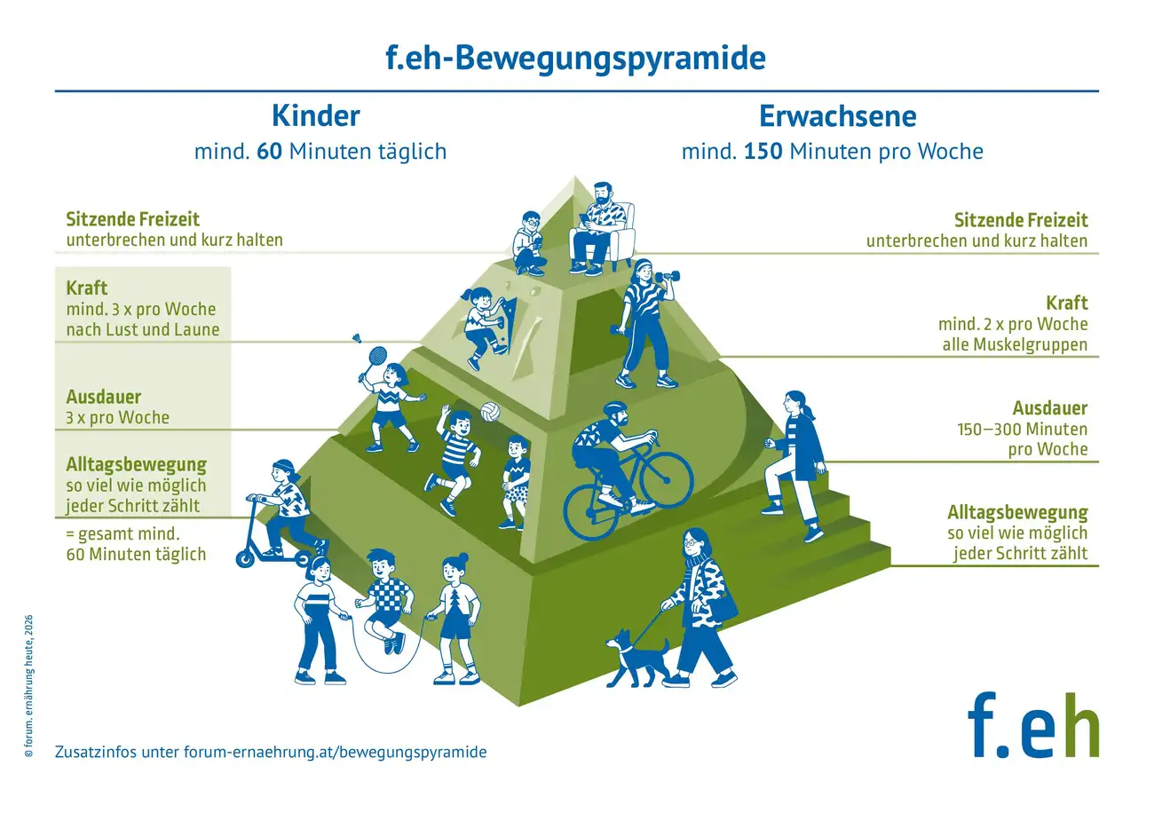 Hier setzt die f.eh-Bewegungspyramide, die von den Österreichischen Bewegungsempfehlungen des Fonds Gesundes Österreich (FGÖ) abgeleitet ist, an: Die Spitze bilden – wie das „Süße“ und Snacks in der Ernährungspyramide – die sitzende Freizeit und der Müßigang als etwas, das idealerweise bewusst zur Entspannung, jedoch nur in Maßen Platz hat. Das Fundament sind Alltagsbewegung, aktive Pausen und die Verteilung über den Tag, weil sie regelmäßig und ohne großen Zeitaufwand möglich sind. Dazwischen finden sich Ausdauer- und Kraftsport.