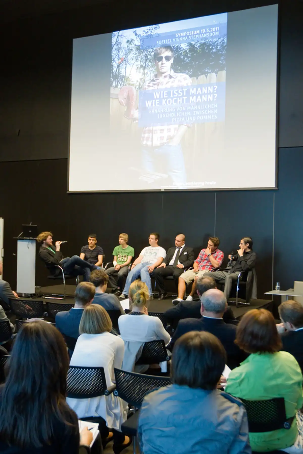 Abschließend diskutierten sechs junge Männer über ihre Essgewohnheiten. Matthias Rohrer (jugendkultur.at, Wien) leitete die lockere Diskussionsrunde, die im Anschluss von der Ernährungswissenschafterin Mag. Angela Mörixbauer (eatconsult) analysiert wurde. Die Einstellungen und Vorlieben beim Essen und Trinken gingen durchaus mit der Literatur konform, z. B. wurde Fleisch (Steak) von den meisten als Lieblingsessen genannt. Der Imbiss- oder Kebabstand sind beliebte Orte, um schnell einen Snack einzunehmen. „Gesund" gegessen wird zu Hause, wenn die Mama kocht. Bei Markenartikeln gelten besonders manche Getränke als Statussymbol. Das Ernährungswissen beziehen die Jugendlichen aus der Schule und aus einschlägigen Fernsehsendungen. Kochen lernen würden einige der jungen Männer, damit sie sich versorgen können, falls die Mama oder die Freundin nichts zu essen bereit stellt.
